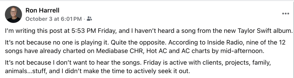 Taylor Swift’s new album dropped Friday, October 3rd at midnight. I didn’t think about it until I noticed a story 18 hours later on Inside Radio about the daily radio reaction to The Life of a Showgirl.